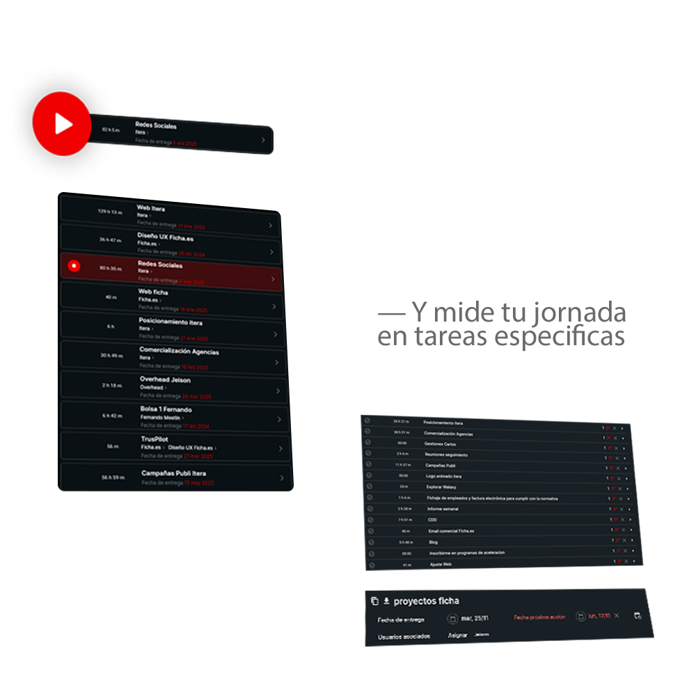El timetracker es tan simple como presionar «iniciar» cuando comienzas una tarea y «detener» cuando terminas. El sistema registra automáticamente cada minuto invertido y lo asocia a la tarea o proyecto específico. No necesitas recordar anotar nada manualmente: todo queda documentado con precisión absoluta.